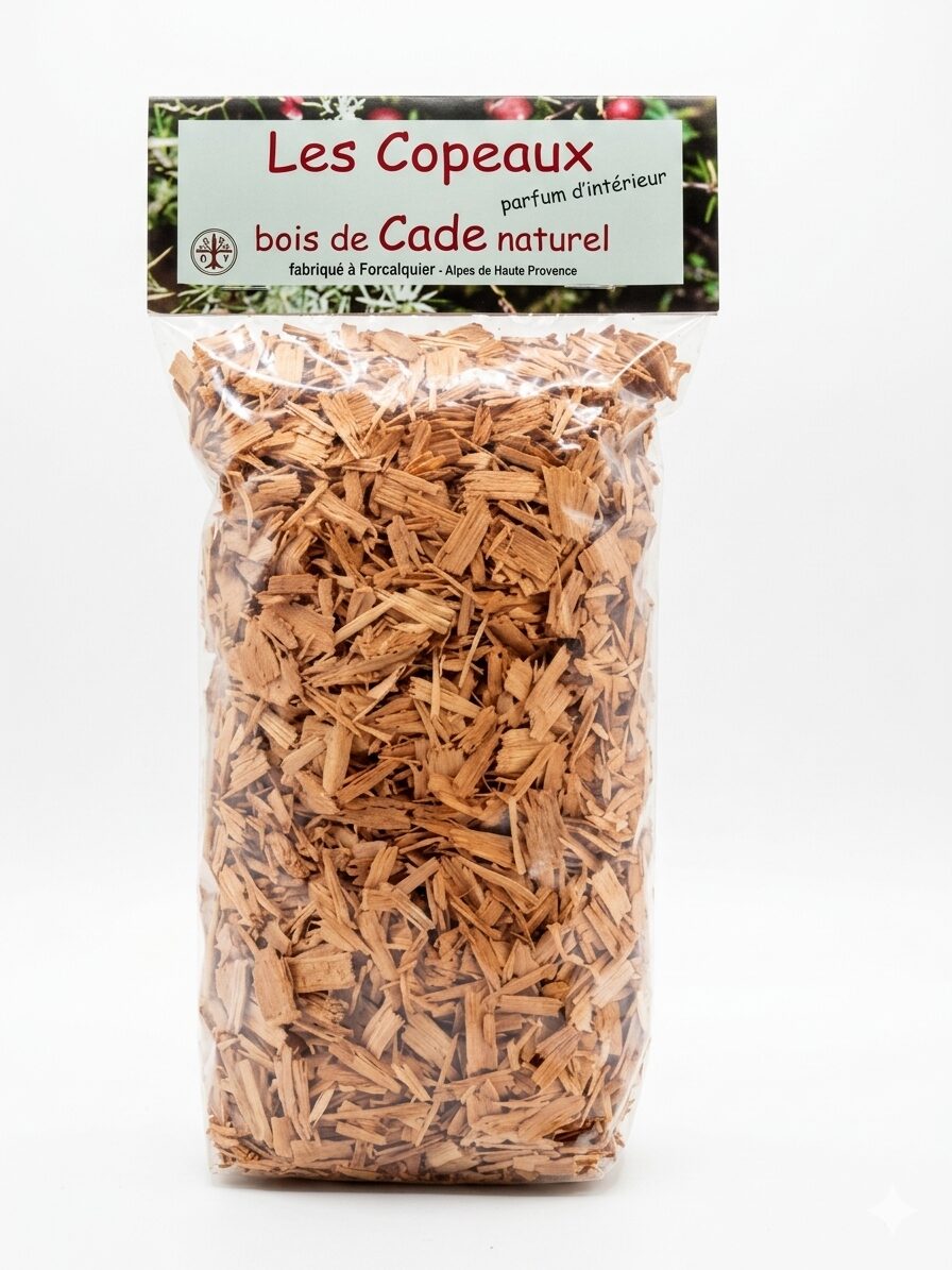On utilise les copeaux de cade pour confectionner des sachets senteurs et antimites, des pots-pourris ou comme parfum d’aspirateur. Ils sont fabriqués à Forcalquier dans les Alpes de Haute Provence